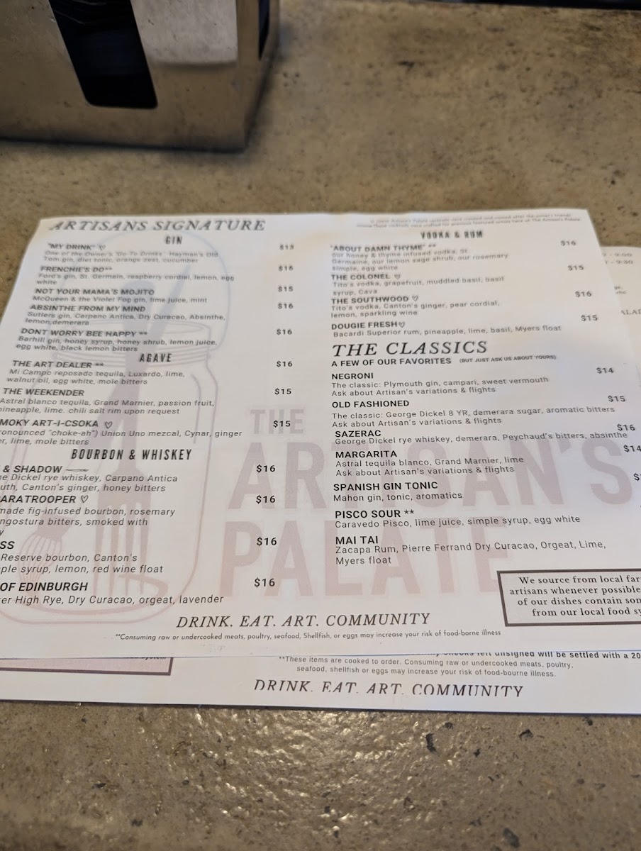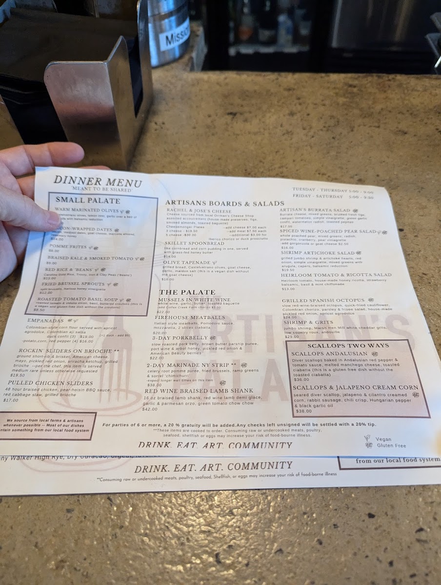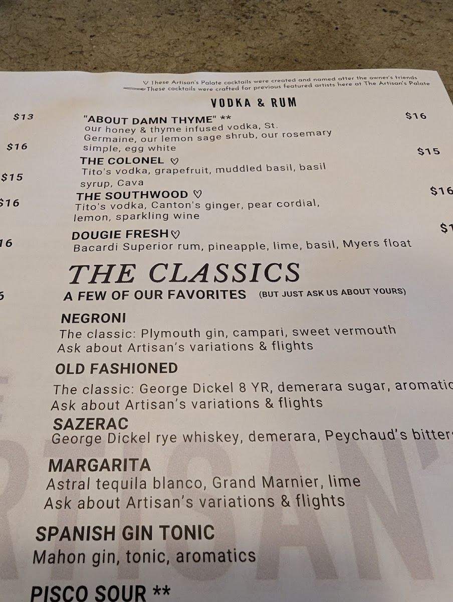 Step into a world of flavor at Artisan’s Palate Menu, where every dish is crafted with care and a passion for fresh, local ingredients. Nestled at 1218 E 36th St A in Charlotte, NC, this menu is a celebration of culinary artistry, offering something for every palate. From savory appetizers that tease your taste buds to decadent entrees that leave you satisfied and craving more, there’s always something to delight in. Whether you’re in the mood for a light bite or a hearty meal, each selection is designed to be an experience in itself, with vibrant flavors that reflect the heart of the season. Indulge in dishes prepared with an eye for detail, combining traditional techniques with a creative twist that brings out the best in every ingredient. The menu at Artisan’s Palate is more than just food - it’s a journey through taste, texture, and creativity.